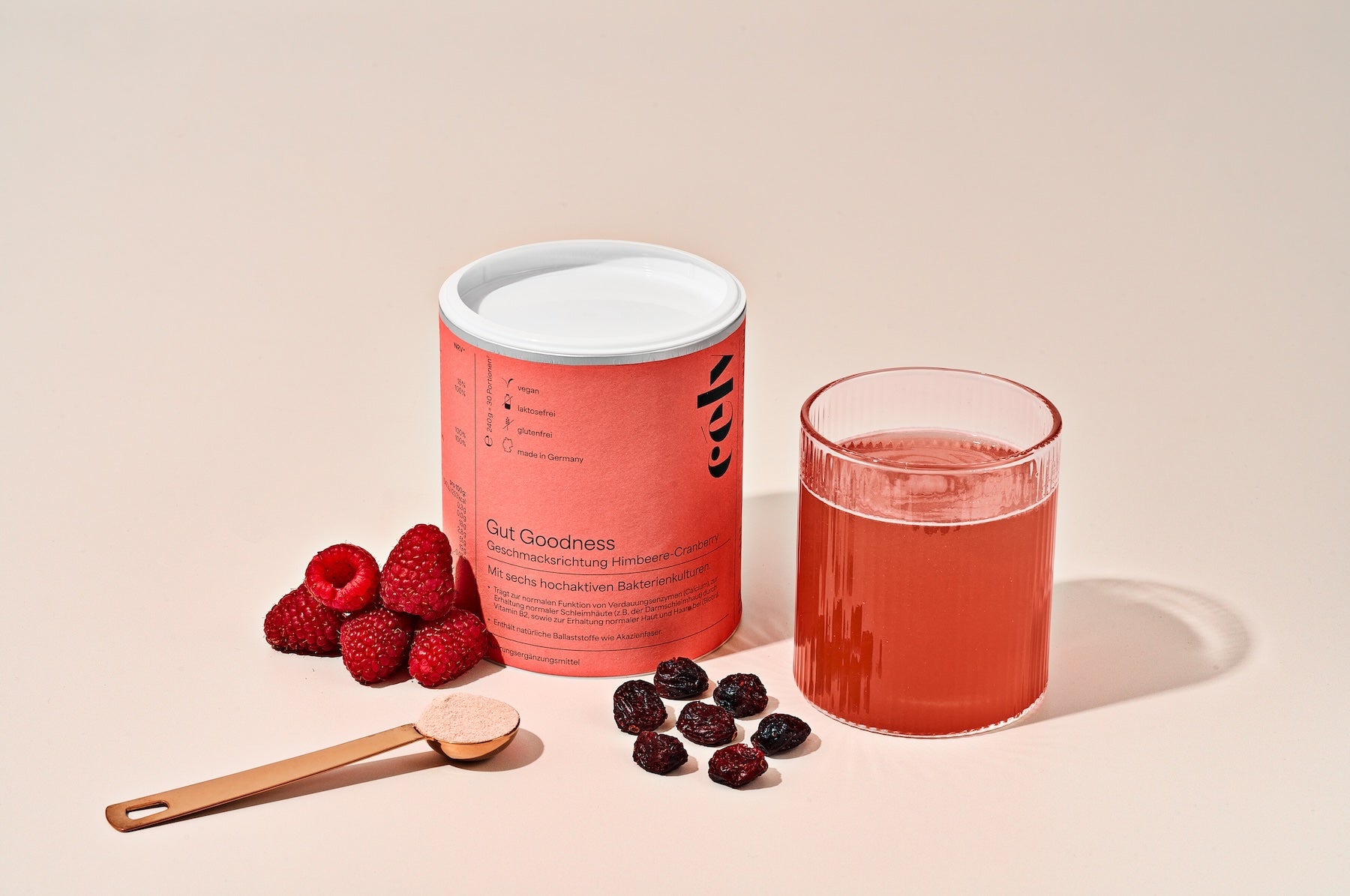 Gut Goodness: Akazienfaser 50 %; Calcium-L-pidolat 11,1 %; Resistentes Dextrin 10,8 %; L-Glutamin; Inulin; Natürliches Cranberry-Aroma 4,7 %; Natürliches Himbeer-Aroma 3,1 %; Himbeer-Pulver; Säuerungsmittel: Zitronensäure; Rote- Beete-Extrakt; Vitamin B3 (Nicotinamid); Süßungsmittel: Steviolglycoside; Bifidobacterium bifidum; Bifidobacterium infantis; Bifidobacterium longum; Lactobacillus casei; Lactococcus lactis; Lactobacillus plantarum; Vitamin B2; D-Biotin